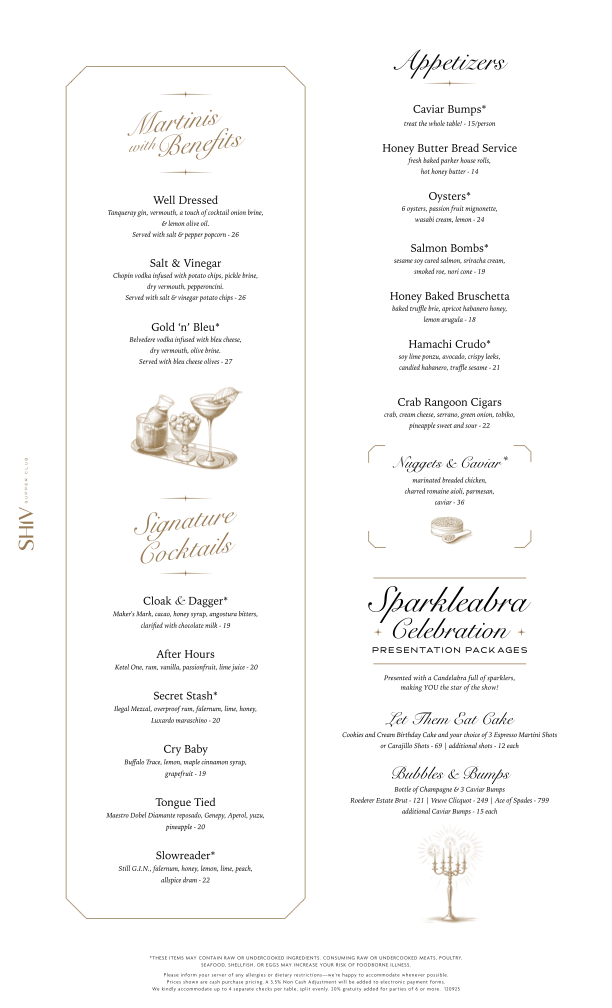 Shiv provides a refined, adult-oriented setting. Guests under 21 are kindly asked to conclude their visit by 10:00 PM.